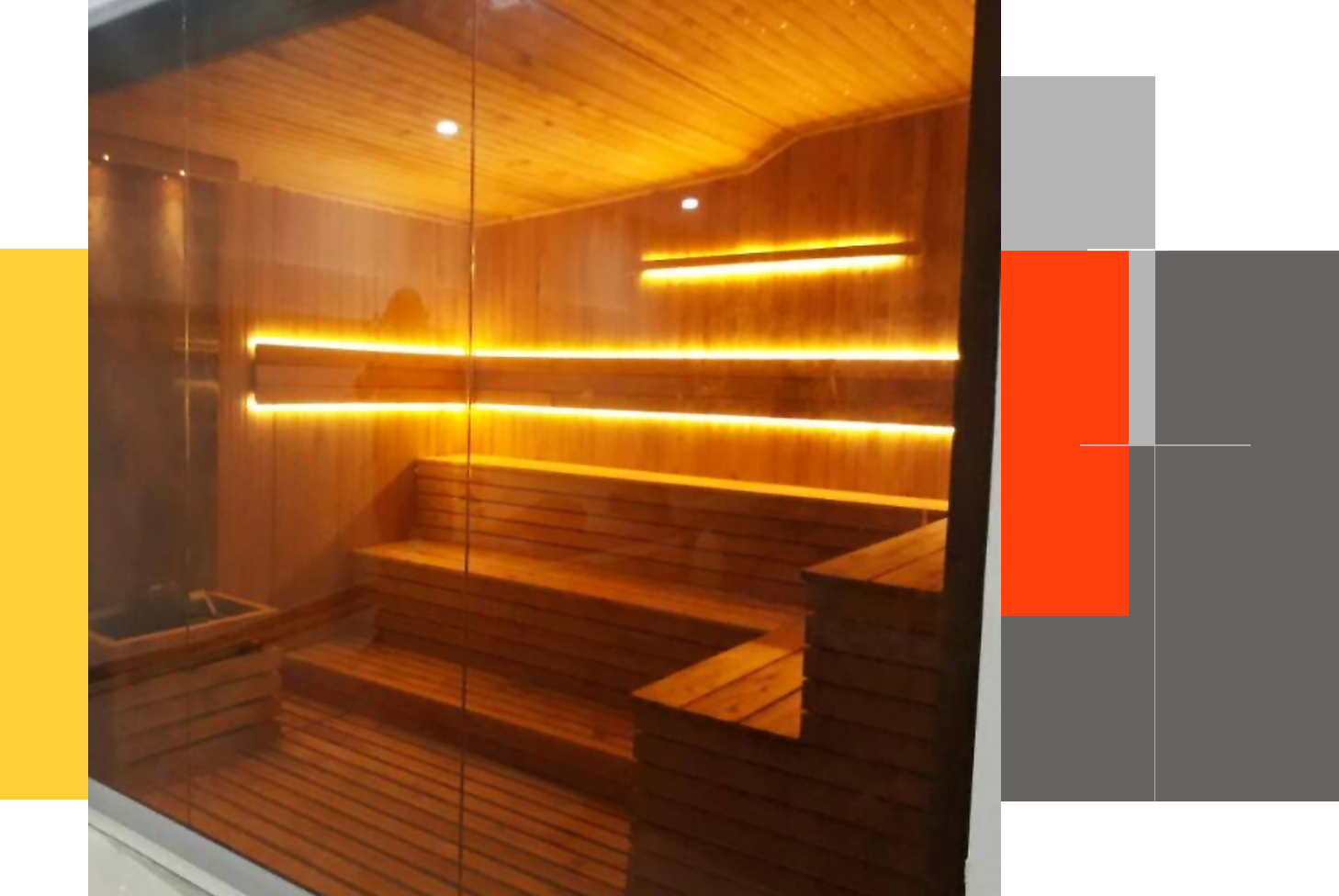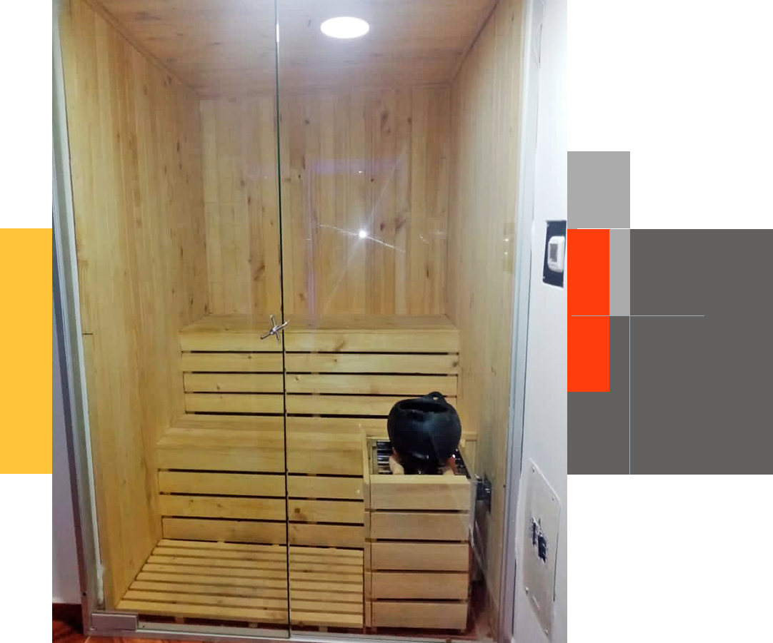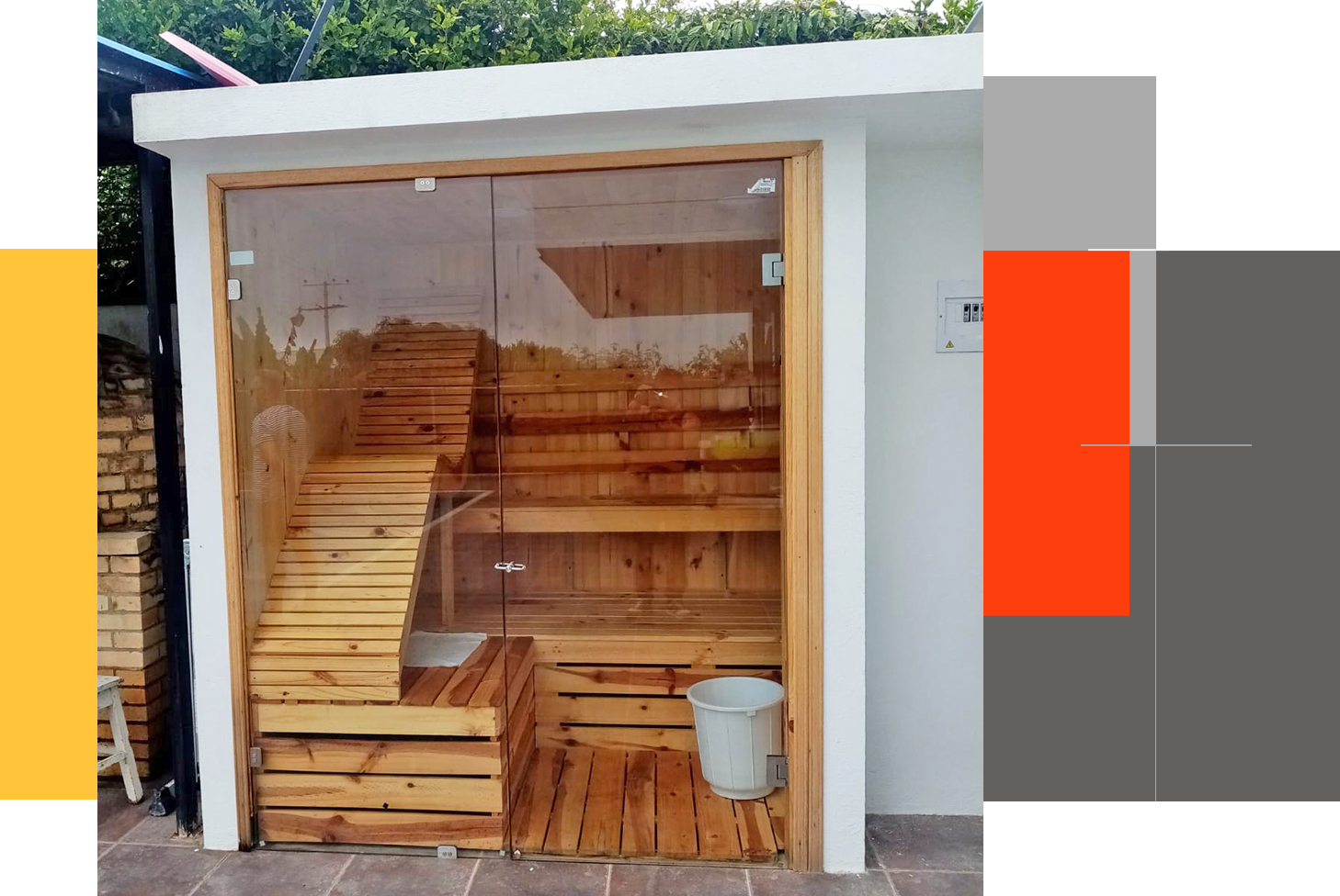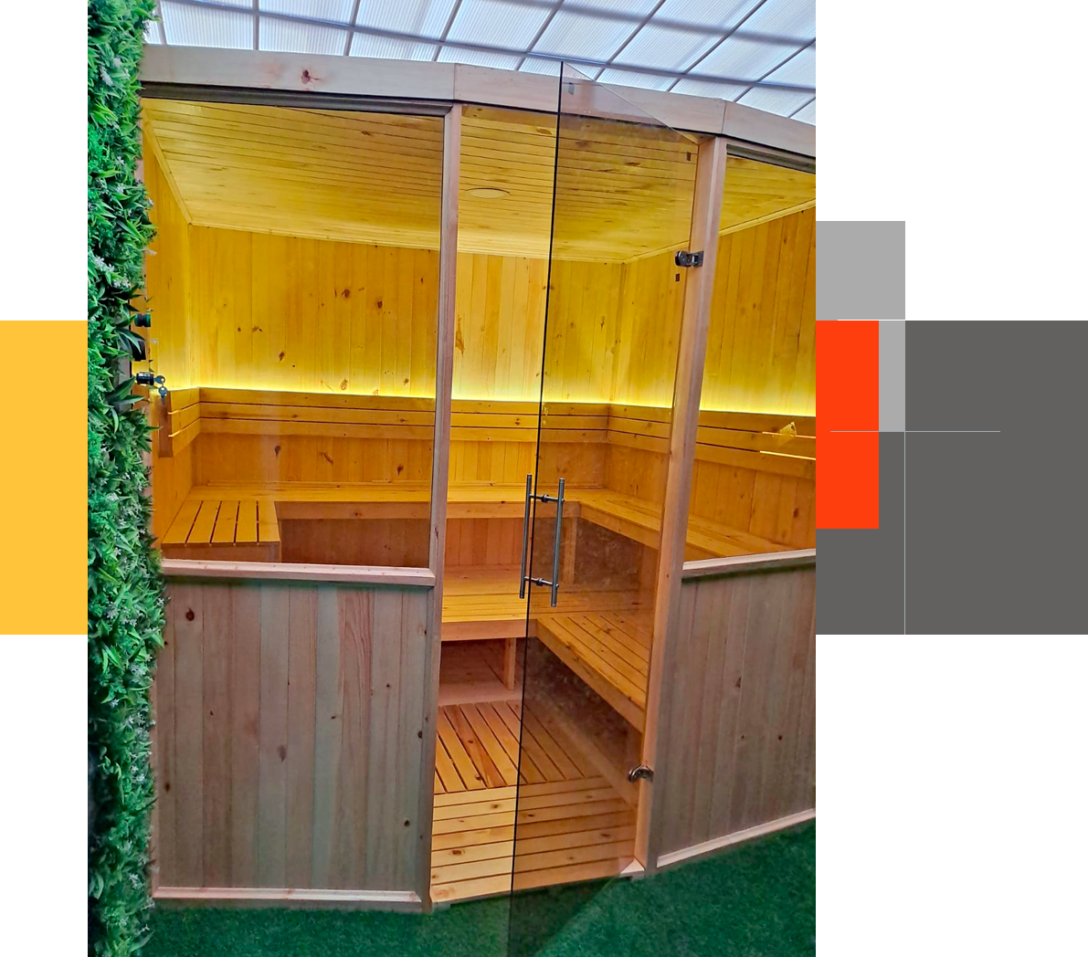 Es un cuarto el cual sus paredes frontales o laterales pueden ser en cristal para así apreciar una mayor vista al entorno este cristal va de 8 a 10 milímetros de grosor tratándose de un cristal templado de seguridad de tono transparente o bronce o a satisfacción del cliente sus cerraduras son de acero inoxidable. Su puerta en cristal o madera a satisfacción, sus bancas a dos niveles o tres dependiendo del área con su respectivo calefactor piedras y suelo rejilla movible para su limpieza.
