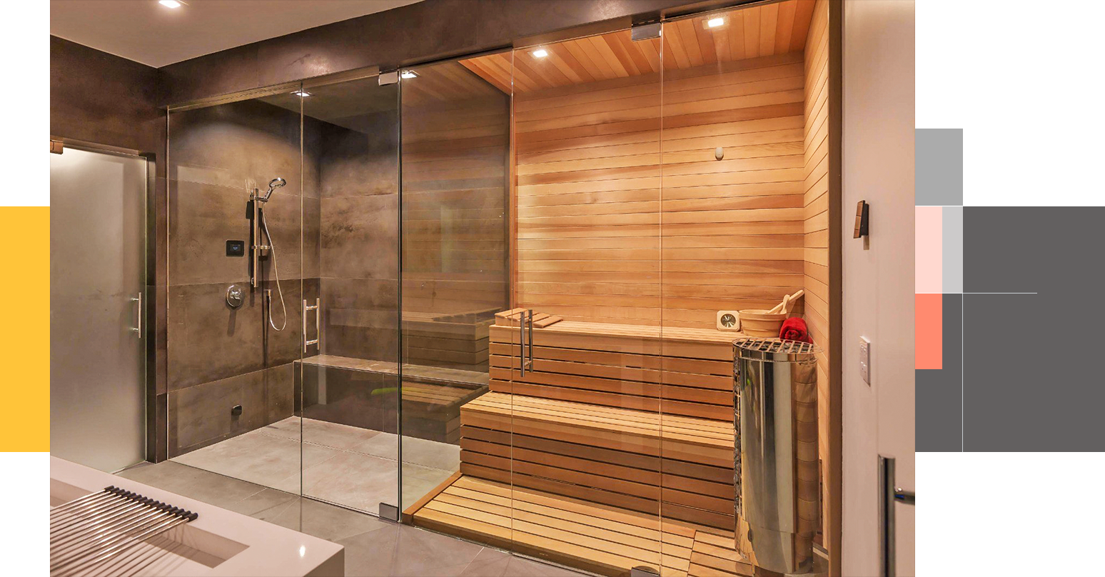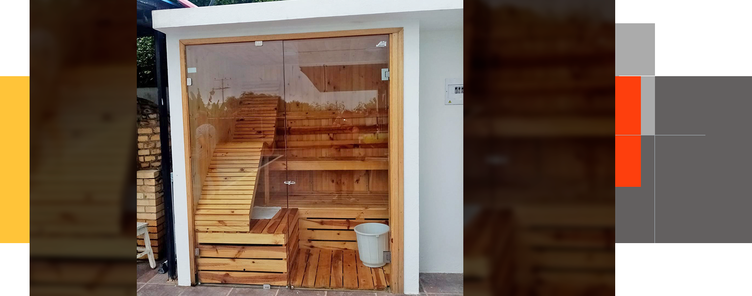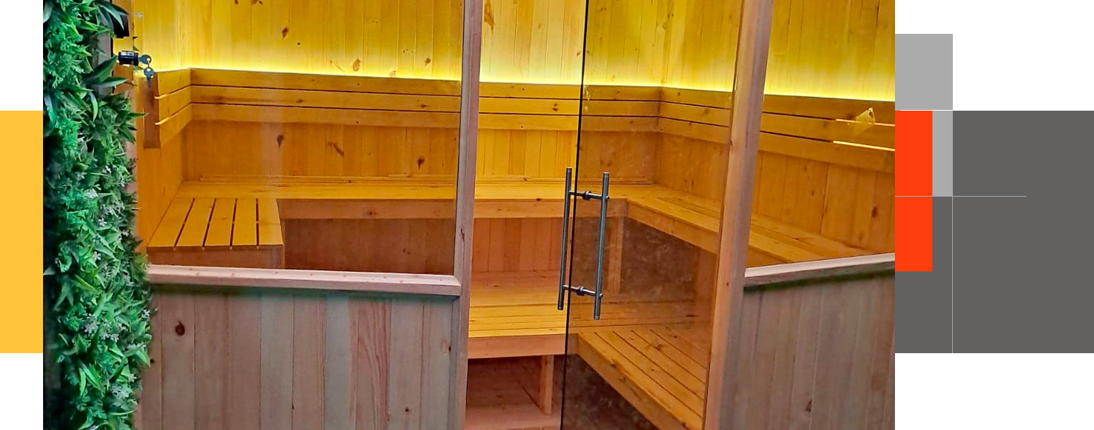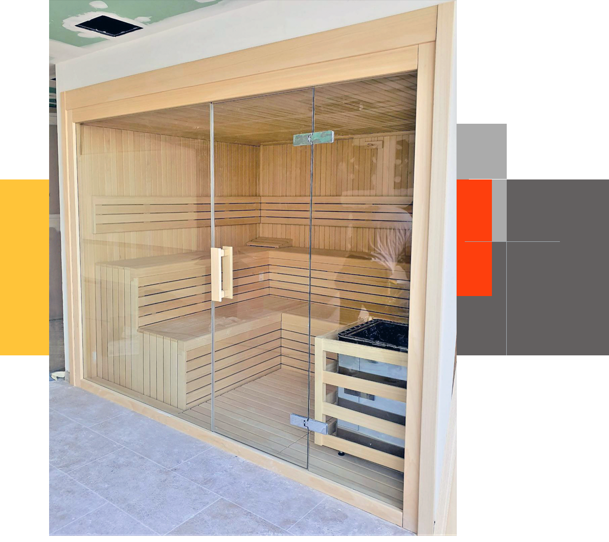Es un cuarto el cual sus paredes frontales o laterales pueden ser en cristal para así apreciar una mayor vista al entorno este cristal va de 8 a 10 milímetros de grosor tratándose de un cristal templado de seguridad de tono transparente o bronce o a satisfacción del cliente sus cerraduras son de acero inoxidable. Su puerta en cristal o madera a satisfacción, sus bancas a dos niveles o tres dependiendo del área con su respectivo calefactor piedras y suelo rejilla movible para su limpieza.