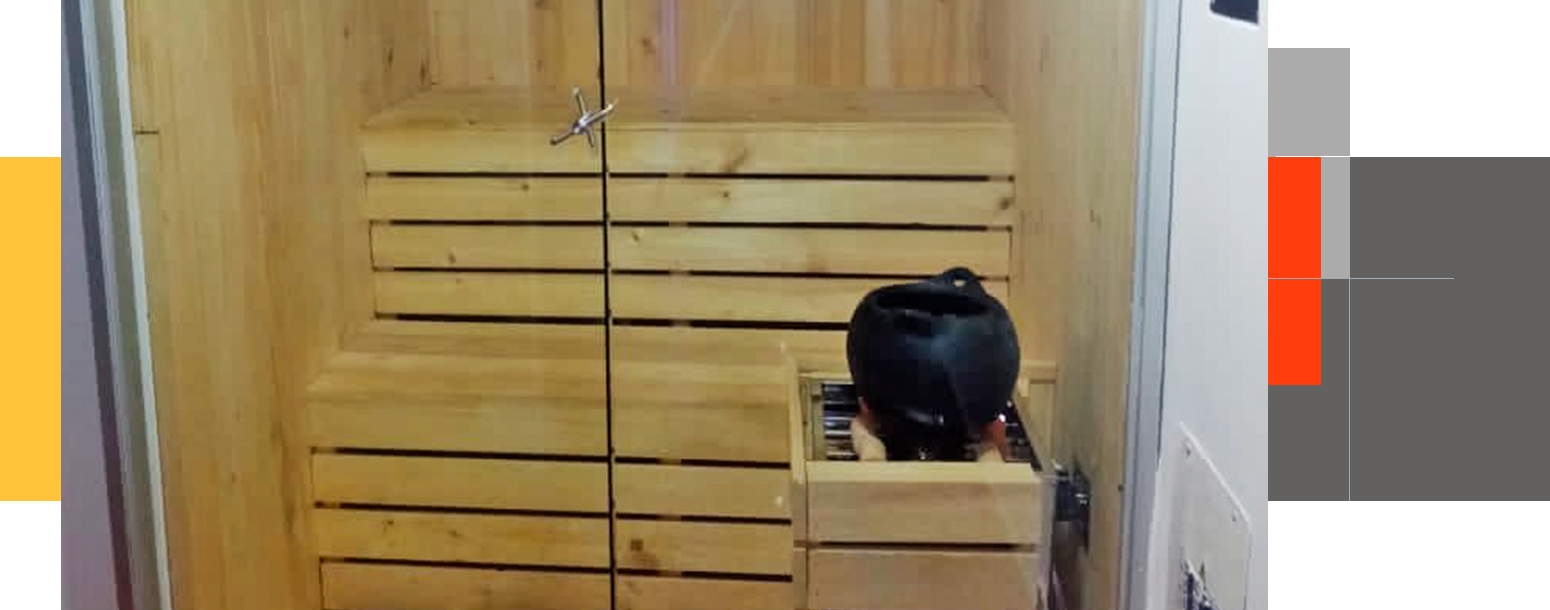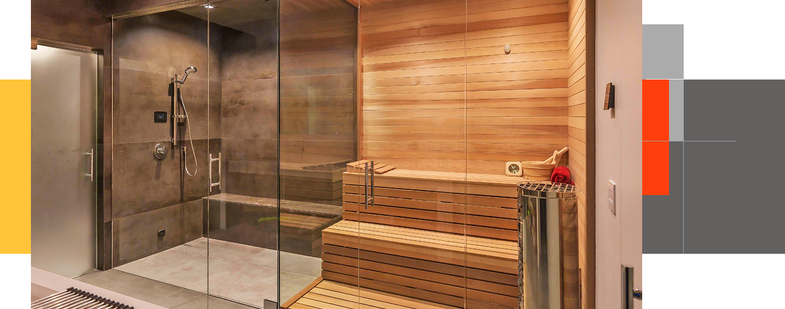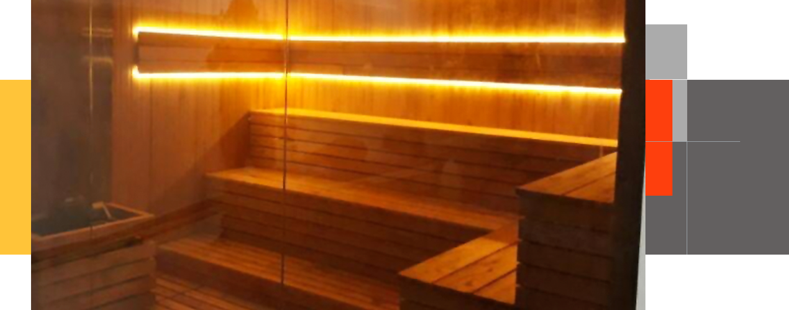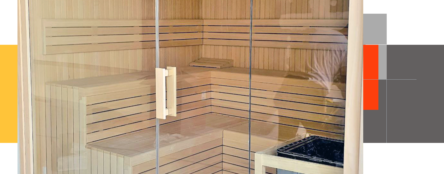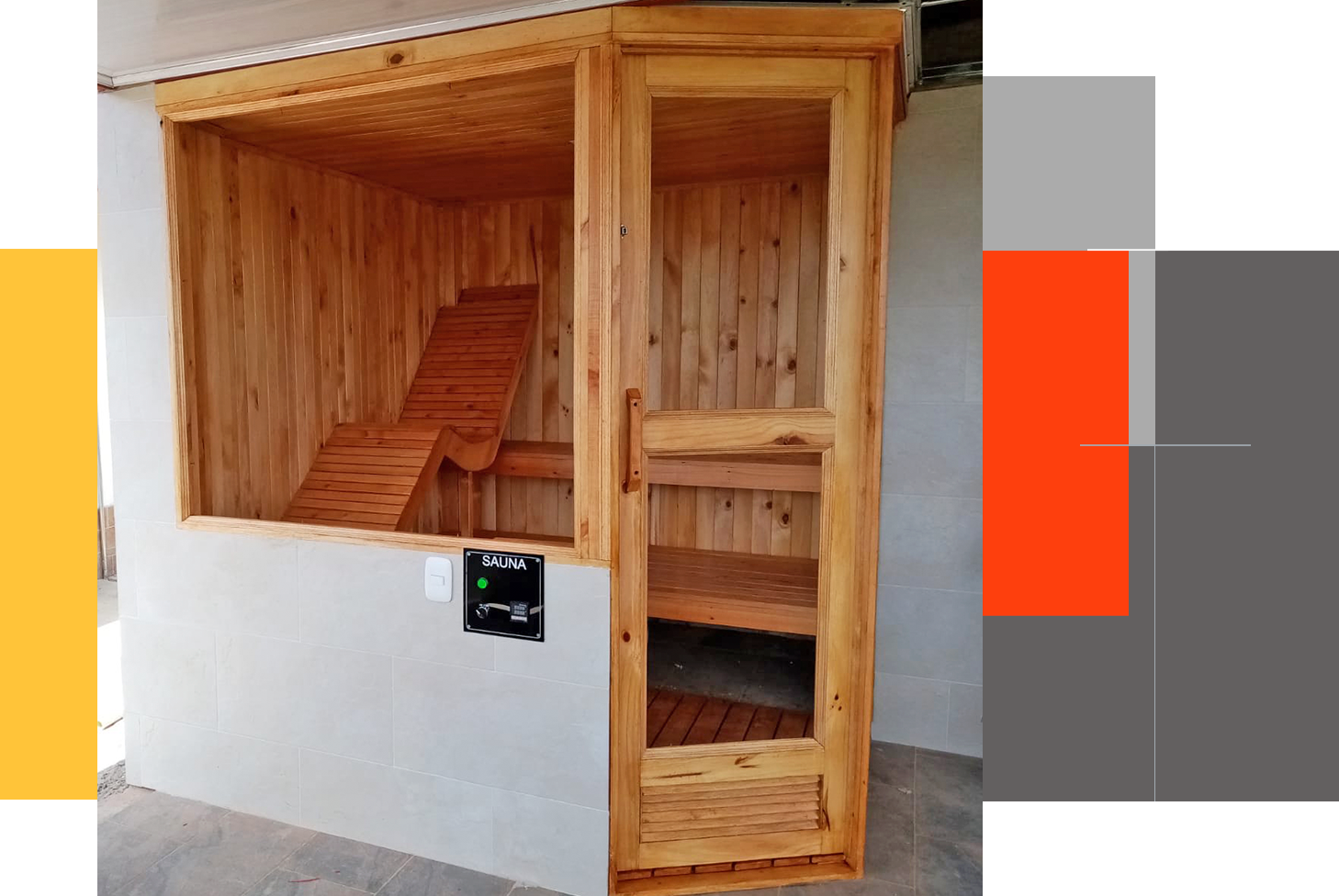 Es un cuarto el cual sus paredes frontales o laterales pueden ser en cristal para así apreciar una mayor vista al entorno este cristal va de 8 a 10 milímetros de grosor tratándose de un cristal templado de seguridad de tono transparente o bronce o a satisfacción del cliente sus cerraduras son de acero inoxidable. Su puerta en cristal o madera a satisfacción, sus bancas a dos niveles o tres dependiendo del área con su respectivo calefactor piedras y suelo rejilla movible para su limpieza.