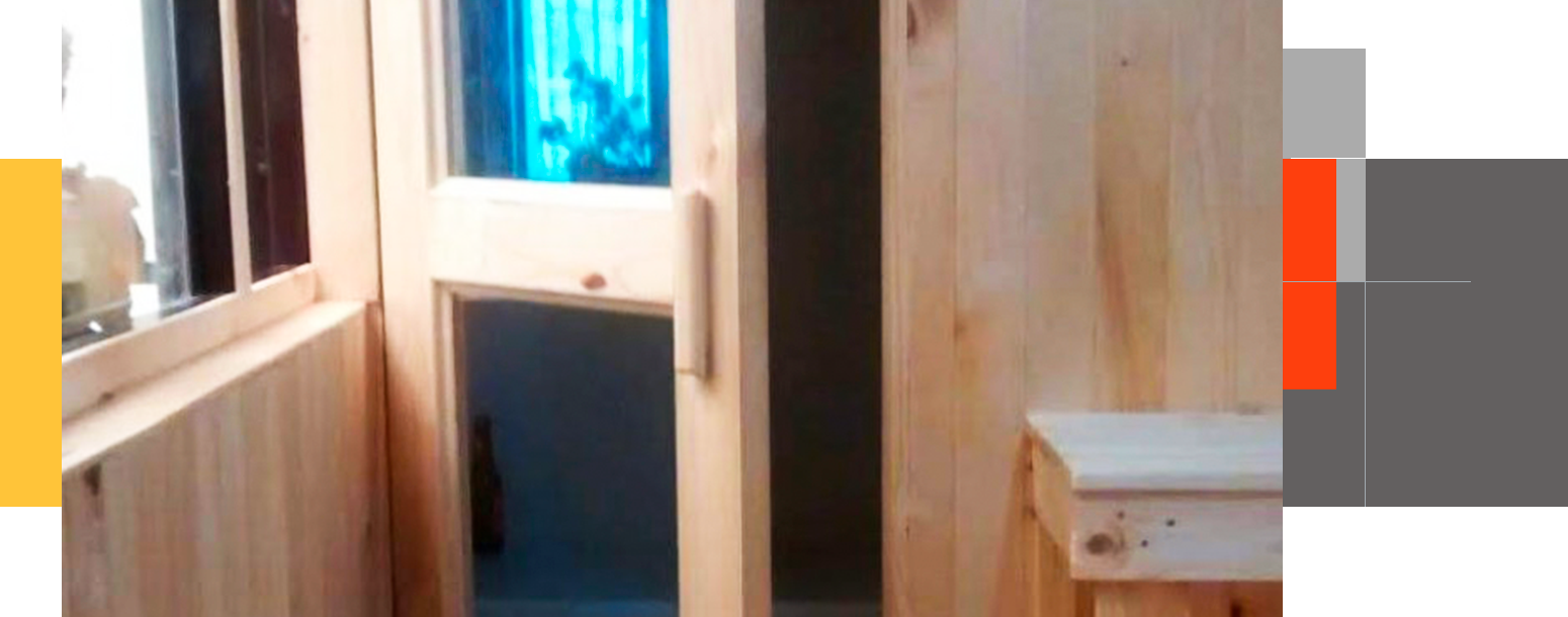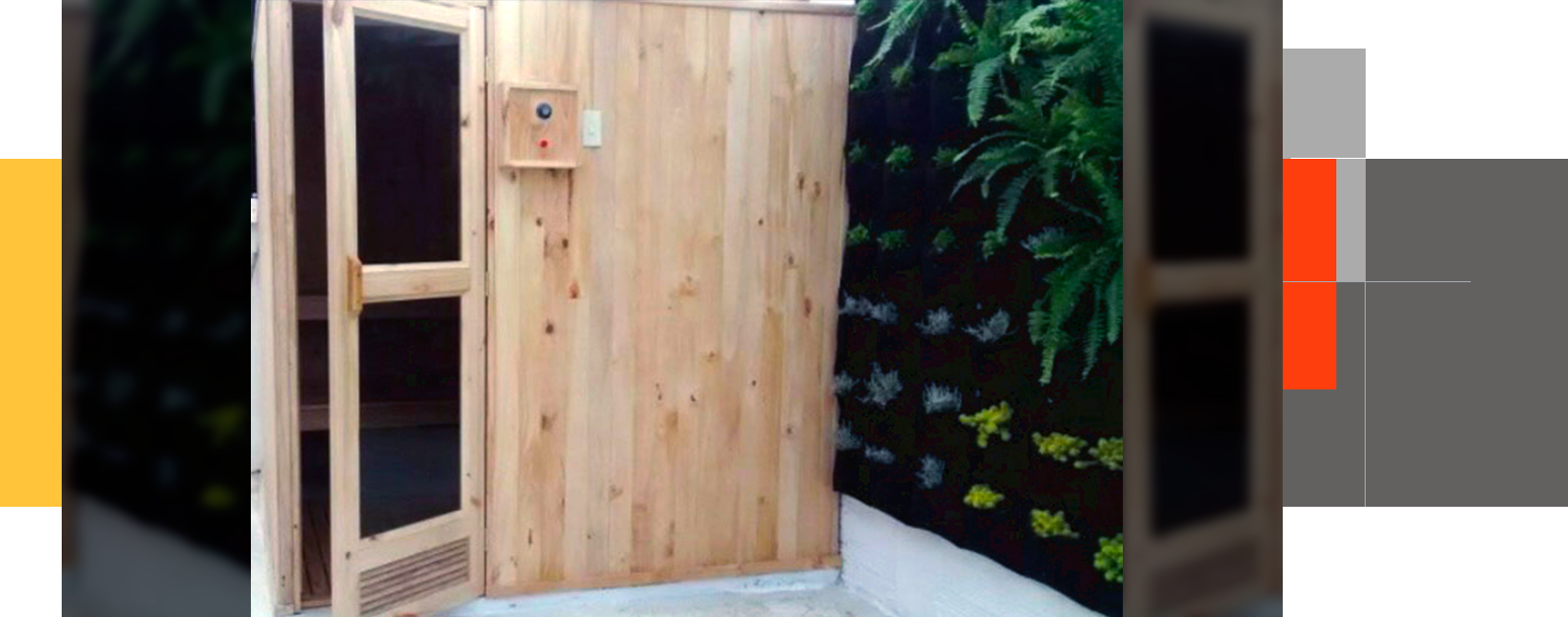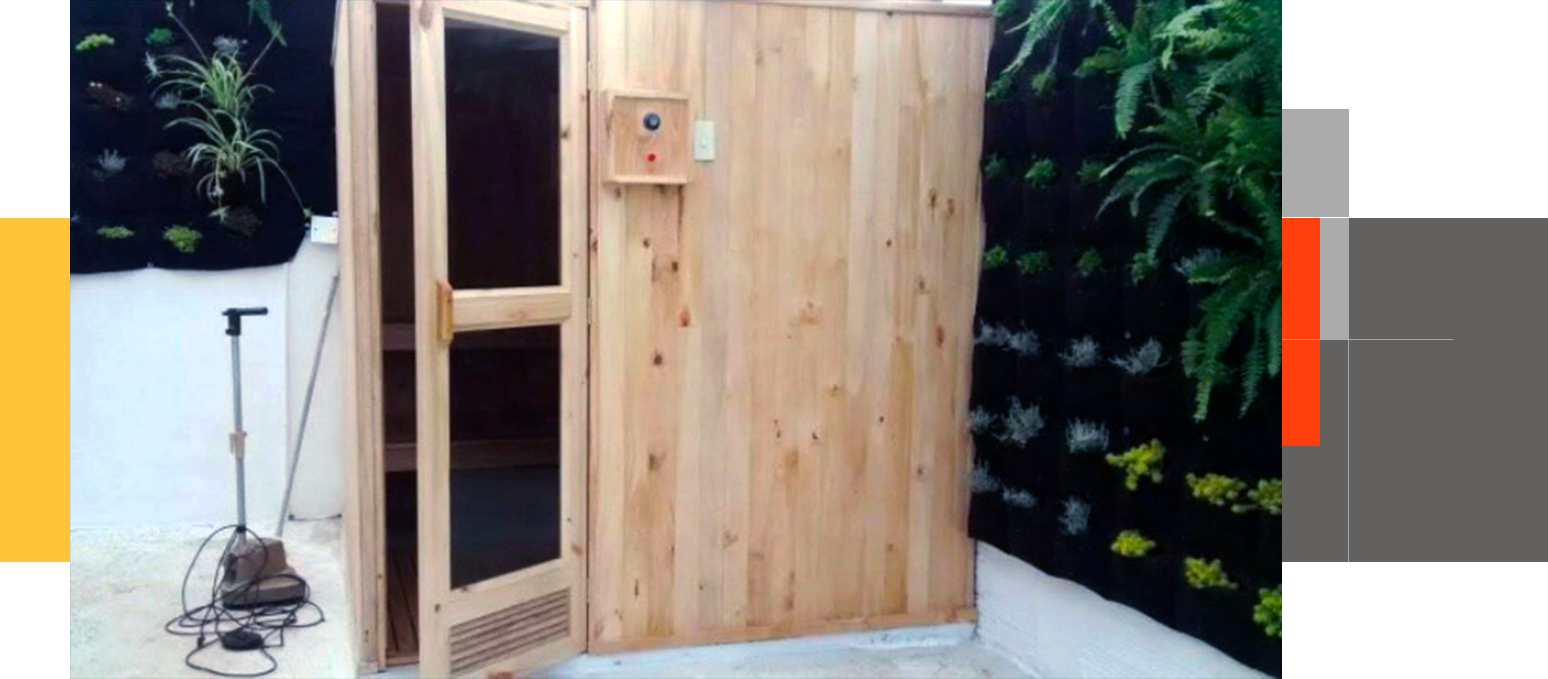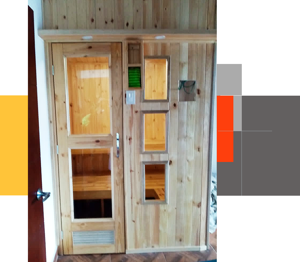 Es un cuarto cabina movible desarmable que cuenta con sus cuatro paredes a 2 metros de altura o 2,20cm dos bancas o tres dependiendo su tamaño con vista en cualquier pared (ventana) calefactor, puerta vaivén, suelo rejilla movible y silla anatómica.