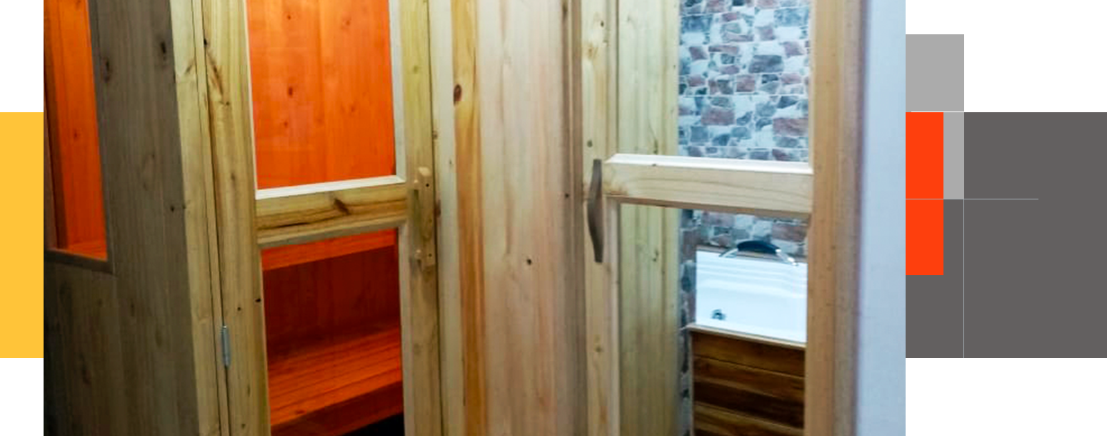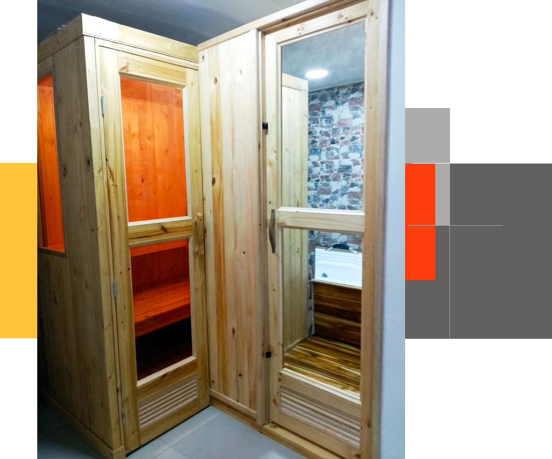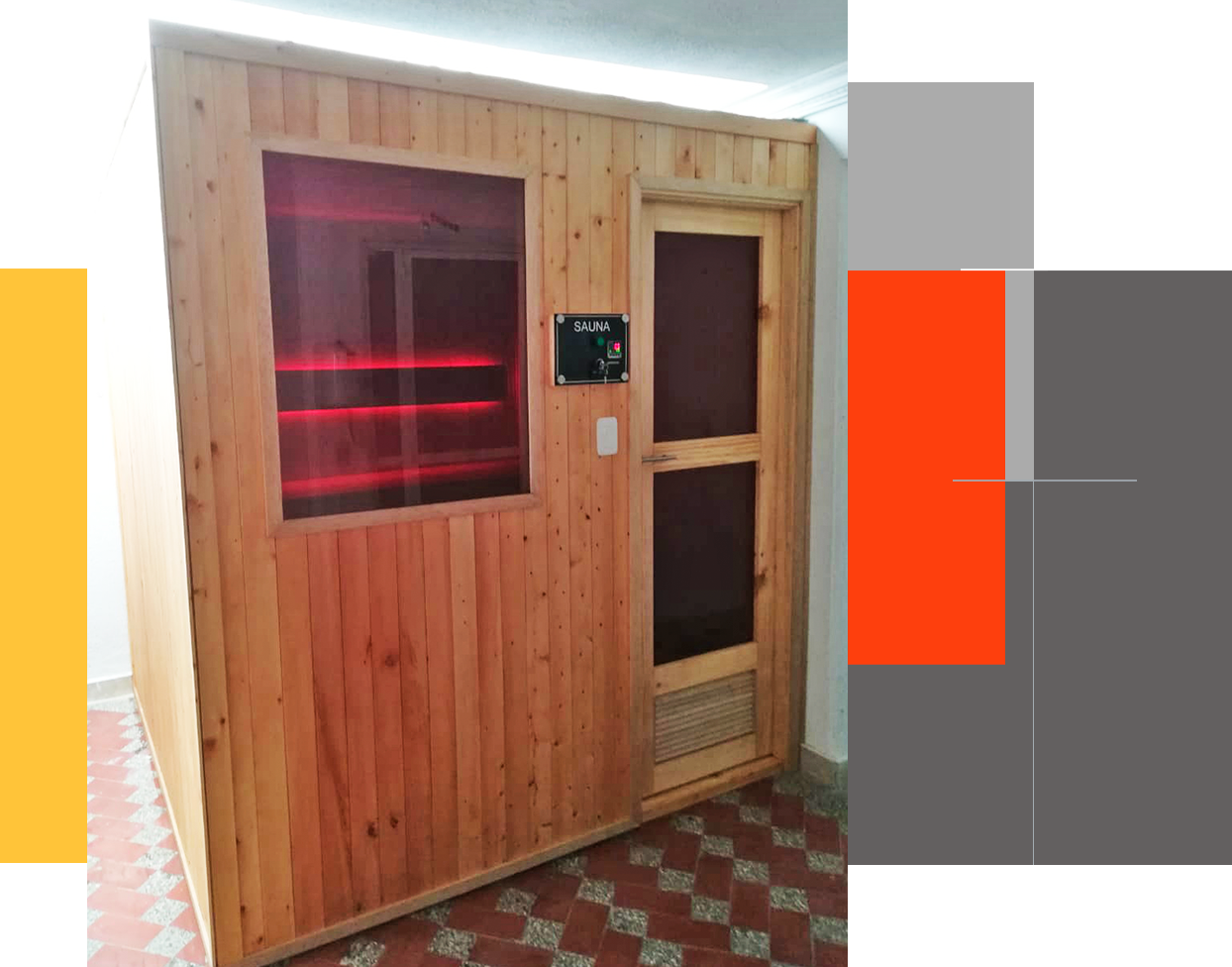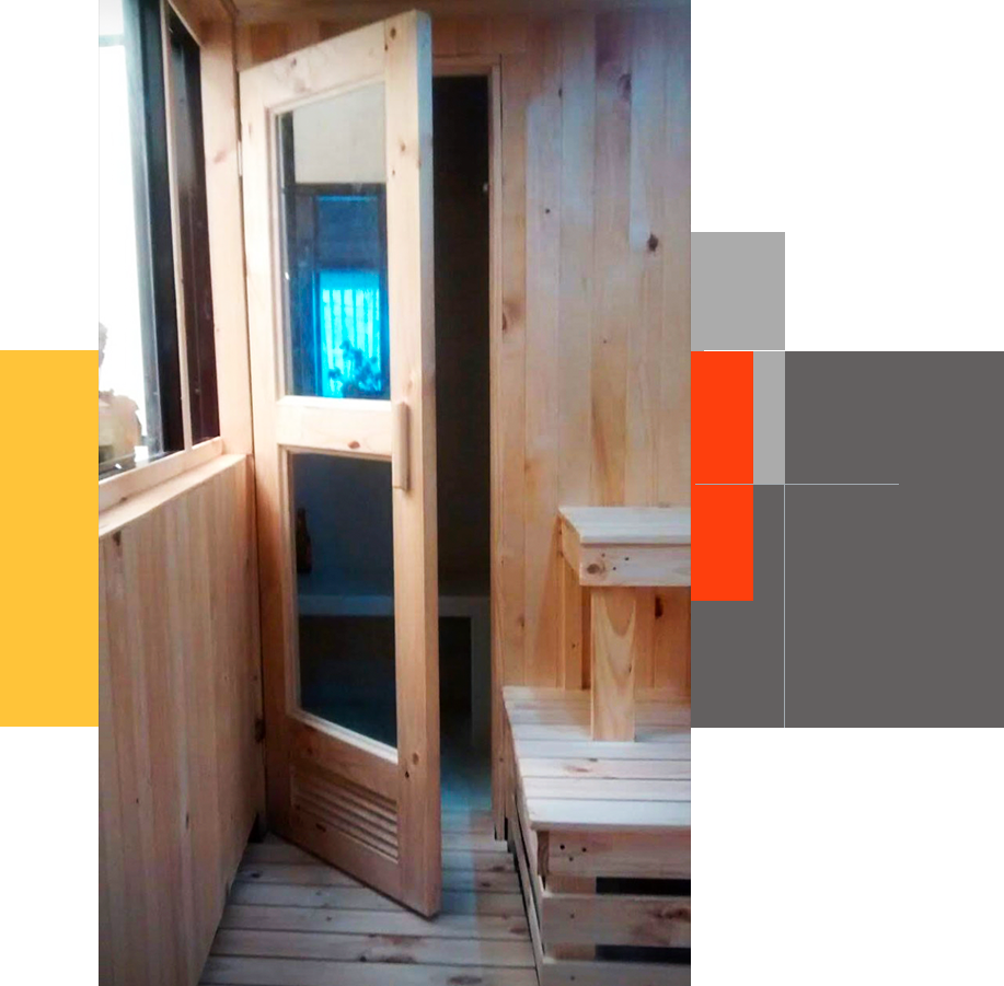 Es un cuarto cabina movible desarmable que cuenta con sus cuatro paredes a 2 metros de altura o 2,20cm dos bancas o tres dependiendo su tamaño con vista en cualquier pared (ventana) calefactor, puerta vaivén, suelo rejilla movible y silla anatómica.